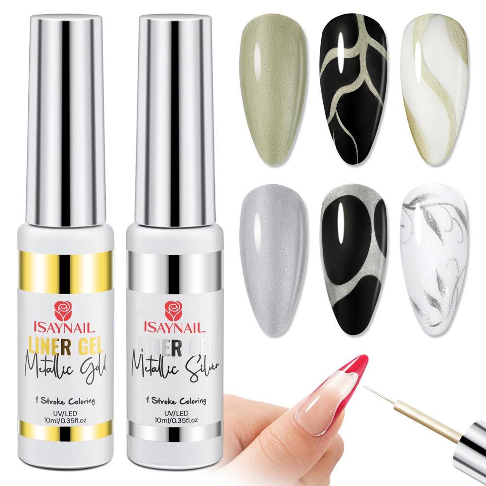 Unleash stunning designs with ISAYNAIL's Metallic Line Art Gel Polish Set. This 10ml UV long-lasting formula delivers vibrant golden & silver for intricate nail painting. Achieve dazzling, durable metallic lines effortlessly. Elevate your nail art to a professional level!